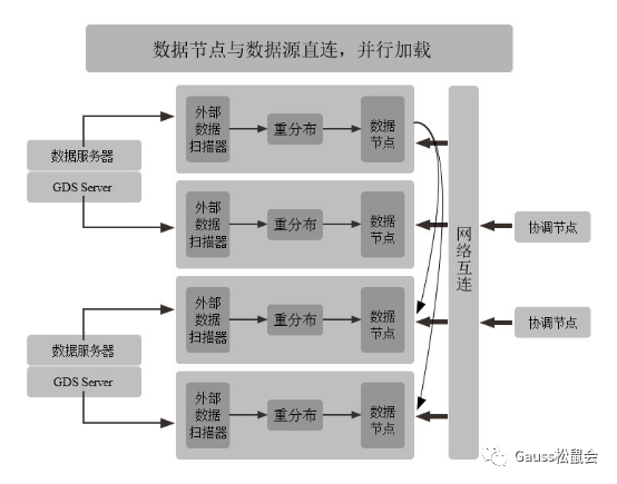 通过并行重分布(Redistribute Streaming)算子技术,让各个DN 都参与数据导入,充分利用各个设备的计算能力及网络带宽。并行数据加载的关键技术如下: