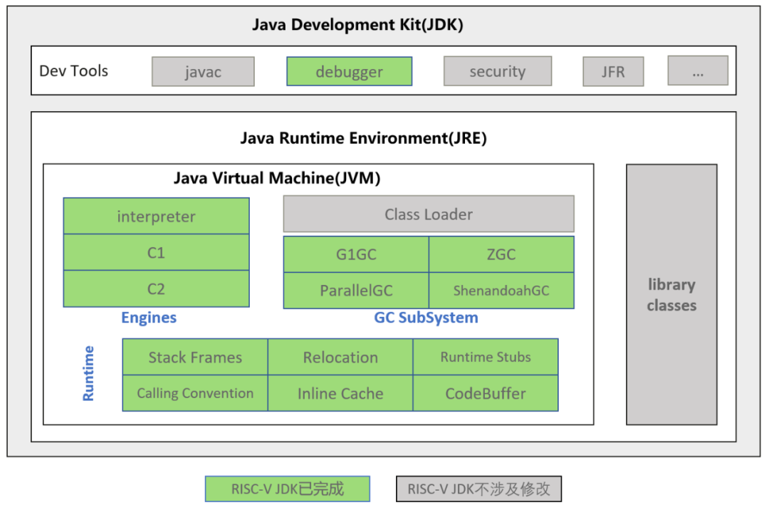 当前 RISC-V port 还提供了 32 位的 Zero 支持,RV32G 后端 port 由中科院软件所 PLCT 实验室团队主导开发,仓库地址:openjdk-riscv/jdk11u [6]。
