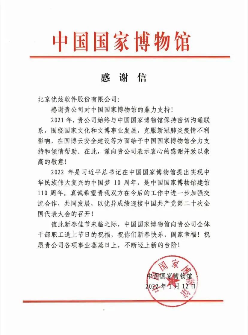 优炫软件收到来自中国国家博物馆的感谢信。对公司各项目团队在实施和服务保障中的突出表现给予感谢和赞扬,对公司的产品价值给予高度评价。