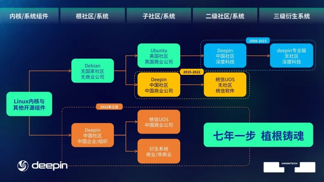 会上,统信软件宣布,将以深度(deepin)社区为基础,建设立足中国、面向全球的桌面操作系统根社区,打造中国桌面操作系统的根系统。深度社区是由统信软件全资子公司—武汉深之度科技于2008年发起,已经持续运营15年,以桌面操作系统为主的开源社区,也是国内规模最大、历史最悠久、活跃度最高的开源操作系统社区之一,深受全球开源爱好者喜爱,具备相当的国际影响力。
