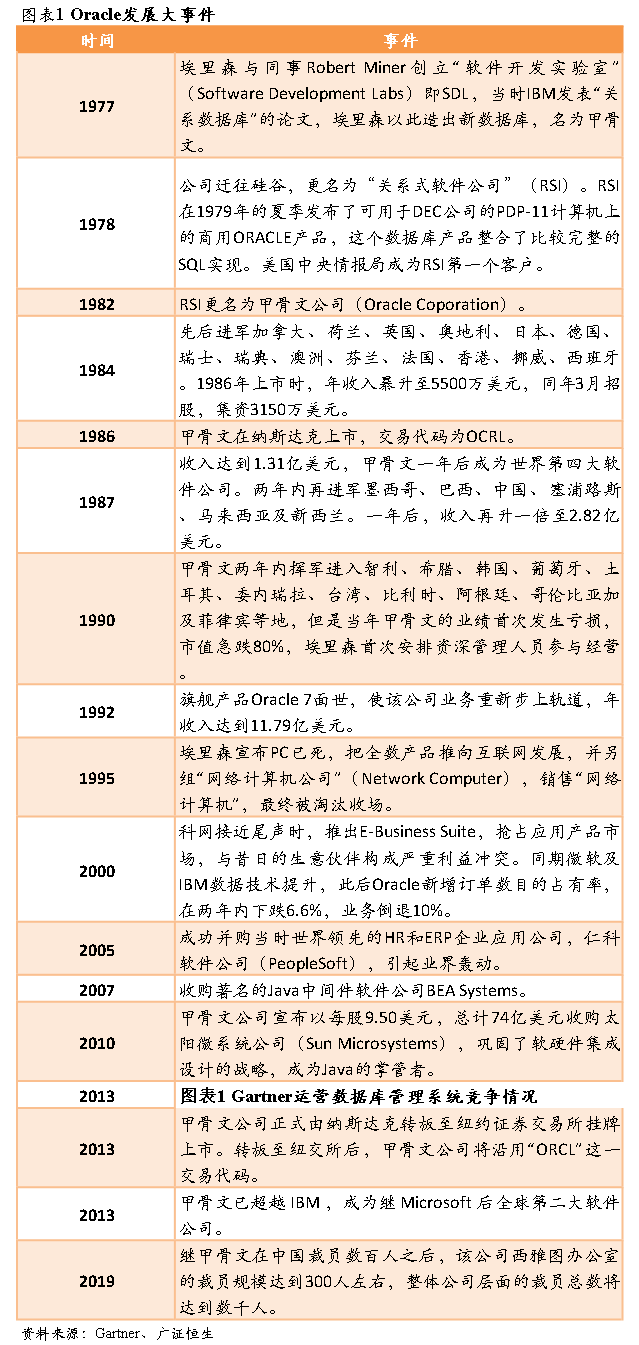 Oracle是关系型数据库软件革命的领导者。埃利森和他的共同创始人Bob Miner和Ed Oates认识到在关系型数据库模型方面存在极其巨大的商业潜力。1977年6月,Larry Ellison与Bob Miner和Ed Oates在硅谷共同创办了一家名为软件开发实验室(Software Development Laboratories,SDL)的计算机公司(Oracle公司的前身)。很快他们就研发出一个半成品,并把这个产品命名为ORACLE。1979年,SDL更名为关系软件有限公司(Relational Software,Inc.,RSI),毕竟“软件开发实验室”不太像一个公司的名字。1983年,为了突出公司的核心产品,RSI再次更名为Oracle。随后几年,Oralce紧跟时代潮流,开发出与IBM的SQL兼容的数据库,追随IBM的Oracle得以成长壮大,逐步占领了主要竞争对手Ingres数据库的市场份额,建立起在数据库市场的霸主地位。1986年3月12日,ORACLE公司以每股15美元公开上市,当日以20.75美元收盘,公司市值2.7亿美元。