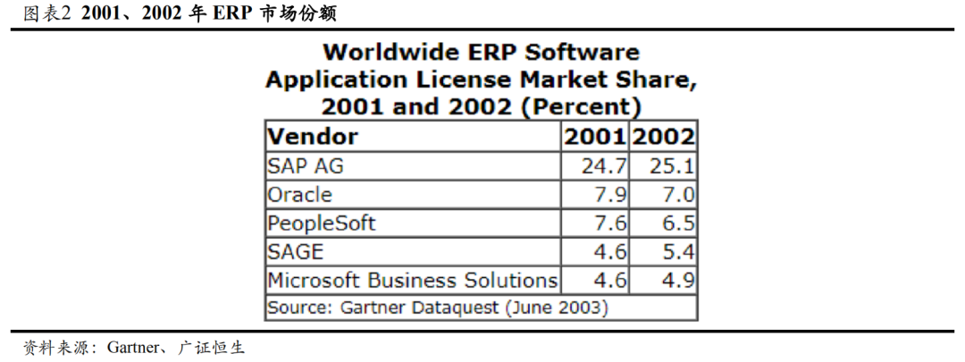 并购浪潮正式开启。经过多年在数据库领域和应用软件领域的积累,Oracle的账上现金及等价物在2004年达到85.87 亿美元,手持大量现金准备并购其他公司。当时Oracle在ERP领域的市场份额排名第二,排名第三的是Peoplesoft。2003年Oracle提出收购Peoplesoft,引起业界轰动,甚至美国司法部落案阻止Oracle的收购。历经18个月的谈判,行业第二的Oracle成功以 103 亿美金将行业第三的Peoplesoft与JDE一起纳入囊中,Oracle在企业管理软件领域的份额大大提升。