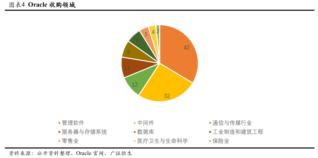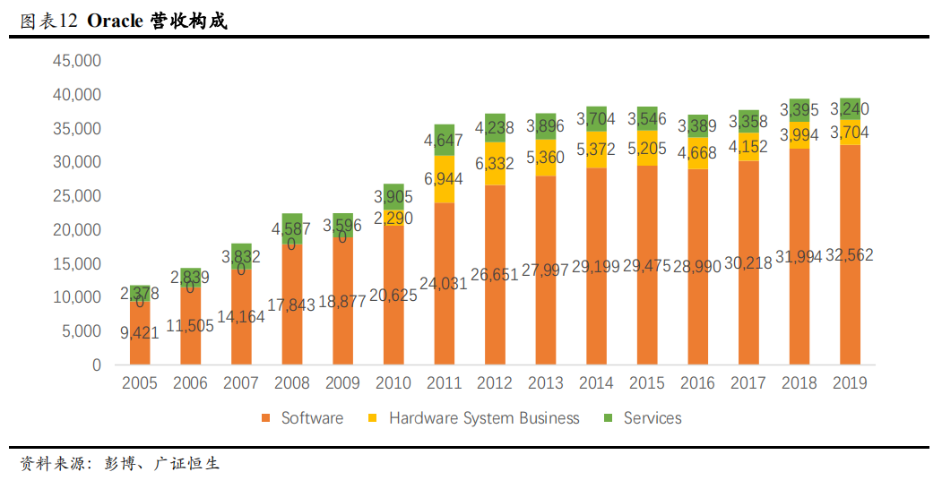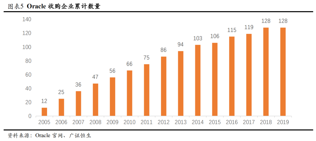 业务扩张期:2000年,Oracle推出E-Business Suite,抢占应用产品市场。一直靠内生创新而少有并购的Oracle,自2005年起,大张旗鼓地收购当时领先的PeopleSoft软件公司,随后一路并购BEA Systems、Sun Systems等巨头公司,在企业软件和中间件市场扩张Oracle的份额。