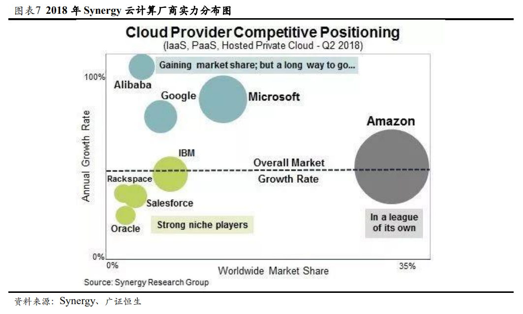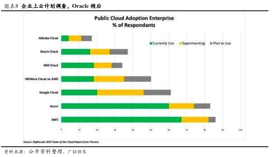 Oracle云转型起步稍晚,目前云计算市场不容乐观。从图表6可以看出,早在21世纪初期,美国五大科技公司就一直加大资本支出,其中亚马逊和谷歌将大量资金投入了云计算。亚马逊早在2006年对外推出商用云服务,最初提供包含 EC2(云主机)、S3(对象存储)、EIP(弹性IP)、RDS(关系数据库)等纯IaaS(基础设施即服务)层面的产品服务。而Oracle 2010年才决定开始云转型,但既没有在云转型上投入过多的研发资金,也没有像AWS或Google重金投入数据中心的建设,直到2016年才开始在云计算领域发力。