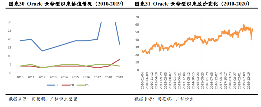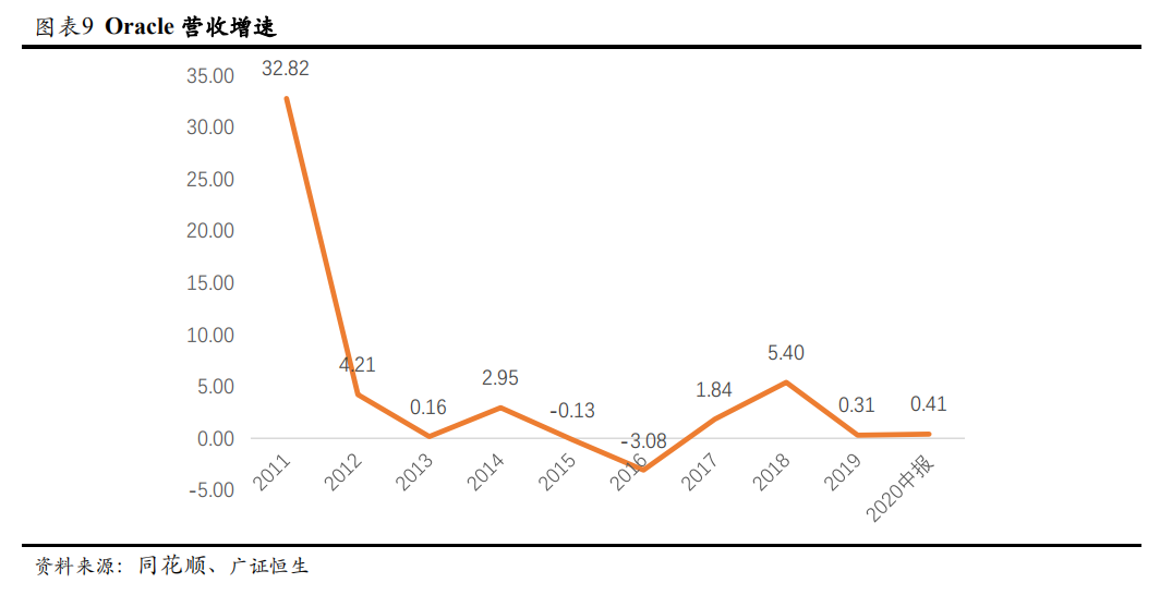 云计算市场高速增长,AWS、微软等在IaaS+PaaS市场逐步占据主导地位, Salesforce、Adobe等已在细分市场占据较高市场份额,因此,考虑到Oracle资本支出受到制约,新增市场争夺处于被动,预计公司的机会主要在存量客户上云。2017年数据库等云化收入占比在10%以下,ERP等云化收入占比只达到33%,对比其他巨头60-90%的云化占比,预计随着自治数据库等一系列云化产品的推出,公司存量客户上云将成为增长点;硬件业务过去5年持续下降,不属于公司业务发展重点。受到疫情影响,短期营收压力较大,预计2021年IT支出将反弹,对于公司收入有明显支撑。