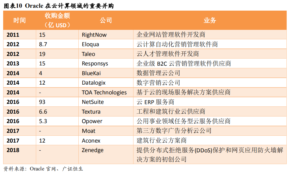 Oracle在云计算领域奋起直追。2010年,甲骨文宣布向云计算转型,五年之后的2015年推出IaaS、PaaS、SaaS全系列的产品,到2018年推出第二代云产品甲骨文Gen 2 Cloud,甲骨文以自洽数据库为重心,主打安全云平台的云计算路线才最终确立。自2010年以来,Oracle加紧收购云软件厂商,尤其是SaaS供应商。Oracle希望通过收购增大其云市场份额,加快云转型的步伐,尤其是2016年93亿美元收购NetSuite,公司希望通过一系列收购与自身相关的ERP或CRM领域,巩固己身优势,或者填补自己的投资空白,实现对SAP、Salesforce、和微软等竞争者的赶超。