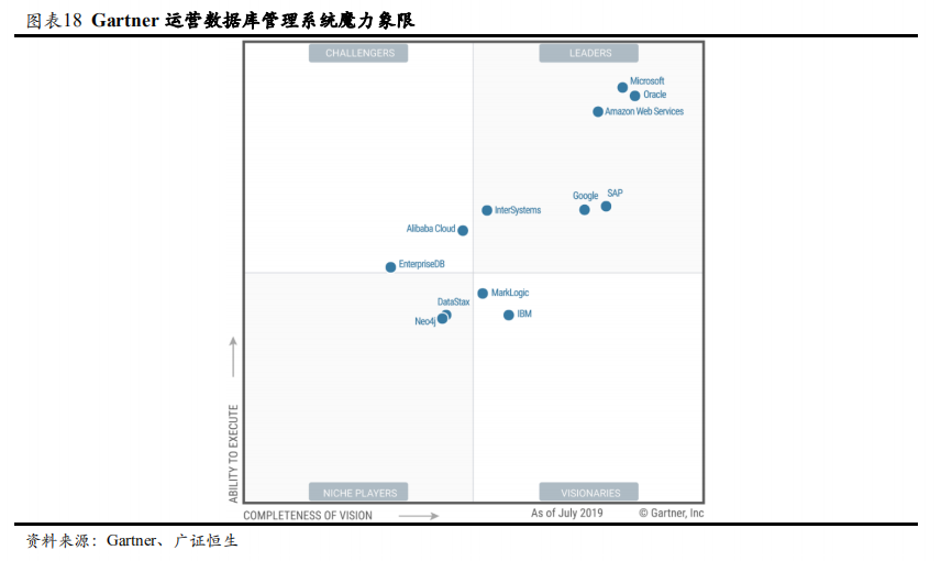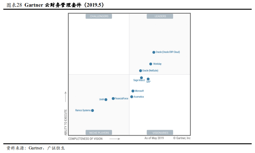 通过自身积累和收购的方式,Oracle ERP云套件涵盖了会计、人力资源、营销、采购、项目管理、销售管理、服务、供应链和运输管理等领域,为客户提供一个全面、敏捷、安全、开放的解决方案。得益于在财务管理软件领域多年深耕和NetSuite的收购,公司在Gartner的魔力象限图中,Oracle和NetSuite分别占第一和第三,处于绝对领先地位。