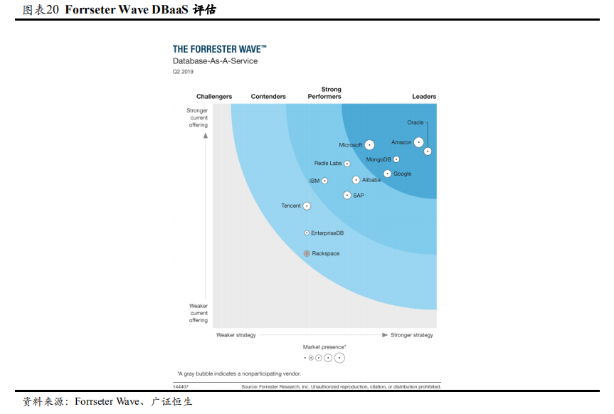 云数据库天然具备云上灵活性,能够提供强大的创新能力、丰富多样的产品体系、经济高效的部署方式和按需付费的支付模式。据Gartner 预测,到2023年,全球3/4的数据库都会跑在云上,AWS、微软等云计算巨头纷纷推出云原生数据库。创业公司方面,分布式开源数据库公司MongoDB得益于其良好的用户体验,以及开源免费的社区,受到中小企业和互联网创业公司的欢迎。国内市场方面,阿里、华为、南大通用、达梦、巨杉等企业有望借助云计算转型占据国内数据库市场主导地位。