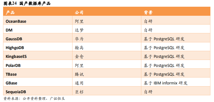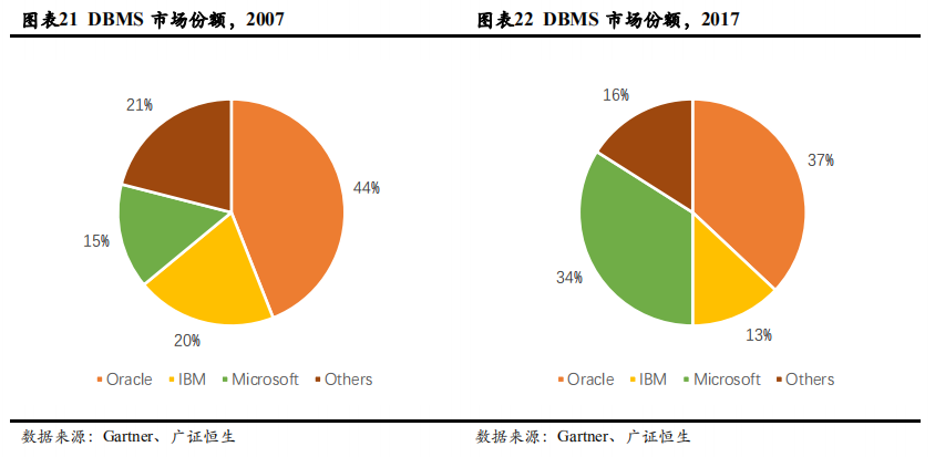 数据库市场被国外厂商垄断,自研企业实力与Oracle仍有一定差距。智研咨询发布的《2020-2026年中国数据库市场深度分析及未来发展前景预测报告》显示:2018年我国数据库软件市场规模为139.25亿元,其中,关系型数据库规模约118.36,占比约85%。Oracle 数据库关系型数据库市场份额超过46%,占数据库市场约39.1%。2017年,Oracle、IBM和微软三家厂商占据市场份额超80%。国产数据库方面,首先是传统大学成立的数据库企业,包括人大金仓、武汉达梦、神舟通用、南大通用、山东瀚高等,其次,近几年主要以阿里、腾讯、华为为代表的互联网公司的研发也加快追赶脚步。从国产数据库的技术来源看,国产关系型数据库多源自或者借鉴开源MySQL、PostgreSQL等数据库及其变种,或收购商业源码(例如Informix)+自研的方式,大数据平台多源自或直接整合开源大数据生态组件,纯自研的国产数据库较少,数据库种类不够丰富,核心竞争力亟待突破。