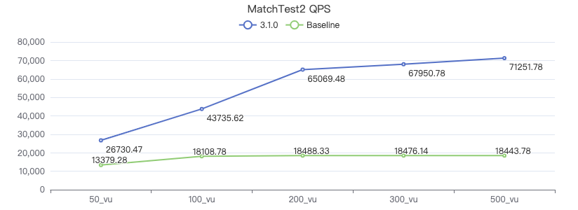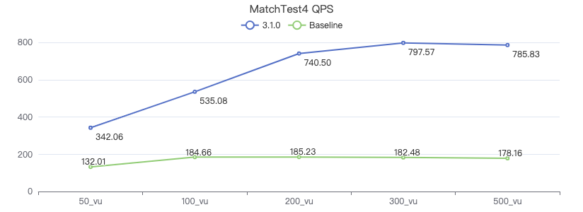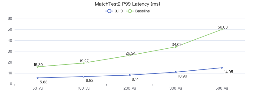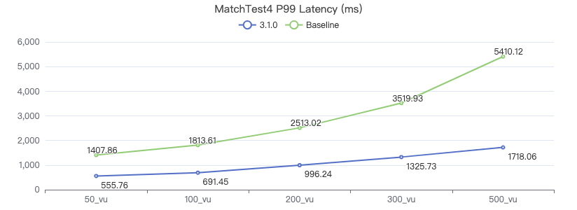 这一性能上的提升在 MATCH 多跳查询中更加明显。在针对同一数据集的测试中,Nebula Graph 企业版 v3.1.0 在并发数为 500 用户的情况下的 MATCH 多跳平均吞吐量较基线版本提升 341.1%,而延时则下降了 68.2%。