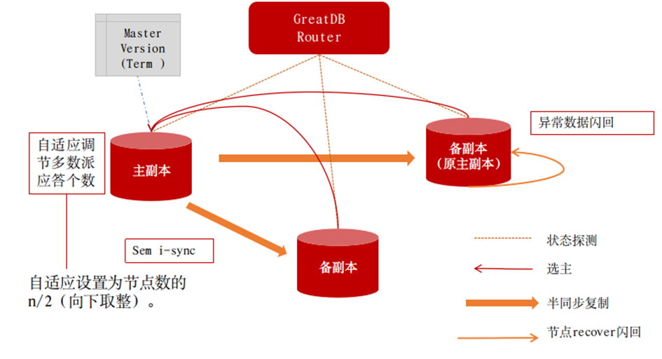基于半同步部署,GreatDB集中式单机配合万里GreatDBRouter高可用组件,可实现自适应半同步多数派判定,以满足多AZ高可用架构的需要,实现半同步故障原主库异常数据自动闪回、故障自动选主、自动等待新主完成relay日志应用、自动屏蔽故障从库等功能,确保节点在故障恢复后的数据一致性和完整性,保障RPO=0,RTO<60s,为业务提供高可靠、持续稳定的数据库服务。