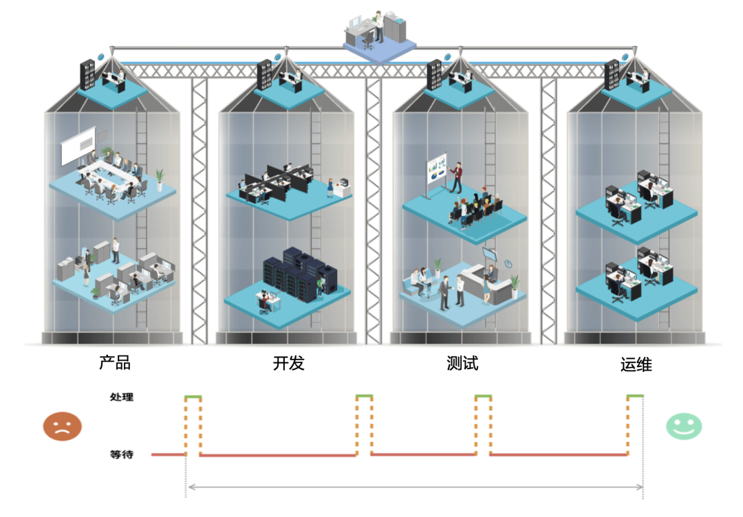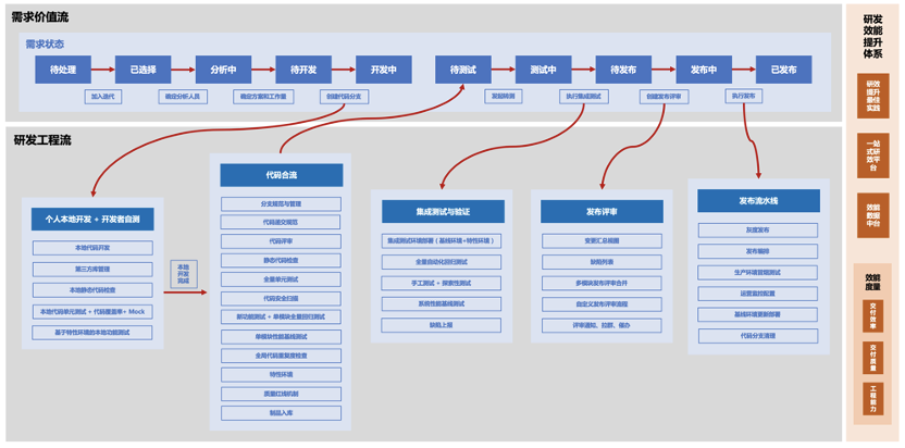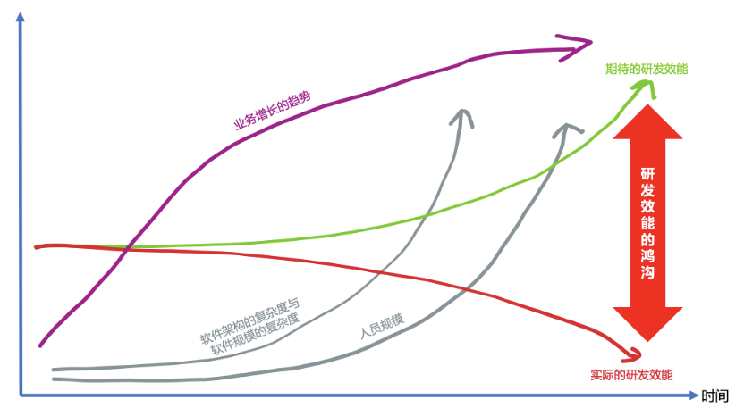 谈到研发效能,我们有着自己的独到见解。我们看到的现象是:只要努力搞,没有折腾不垮的团队。虽然有很多大厂研发效能做的还不错,成为了大家膜拜的对象,但是我们也看到很多“内卷”现象的发生。经历了很多故事,我们更能谈谈自己的理解和感悟。研发效能是目前互联网企业和传统软件企业都高度关注的领域,互联网大厂希望通过“研发效能”实现持续的研发能力提升以应对日趋复杂的产品开发;腰部厂商则希望通过“研发效能”实现弯道超车,充分发挥后来者居上的优势;更多中小企业看到国内互联网大厂不约而同地在这个领域重点投入,纷纷也是摩拳擦掌准备在效能领域发力。一夜之间,似乎只有推进了研发效能,才能提升研发团队的效率,才能让自己在和友商的比拼中不至于输在起跑线上。那么现在企业的研发效能实践到底为企业带来了多大的优势,又帮企业解决了哪些问题呢?那些推行研发效能的企业现在的状态怎么样?研效问题到底解决了吗?别急,这些问题其实大多都还没有解决,而且有些问题可能还变得更糟糕了。毕竟研发效能的实施没有捷径,需要摸着石头过河,肯定不会能像电影里面演的那样注定会有皆大欢喜的结局。经历了风雨,不一定能看见彩虹,更有可能会得重感冒。研发效能问题今天解决不了,不要着急,因为明天同样也解决不了。所以就让我们“放心大胆“地看看研发效能到底是如何搞垮一个团队的。要看懂研发效能如何搞垮一个团队,我们首先需要对研发效能有一个全局的认识,需要先从正向的角度来理解研发效能。和敏捷的概念类似,到底什么是研发效能很难精确定义。其实很多复杂概念也不是定义出来的,而是逐步演化出来的,是先有现象再找到合适的表述。其实,效率和效能也从来都不是软件工程的专有名词,纵观人类发展史,就是生产力和生产效率不断提升的发展篇章,到了数字化时代,软件研发效能的重要性被凸显了出来。如果要用一句话来总结研发效能的话,我们会用“更高效、更高质量、更可靠、可持续地交付更优的业务价值”来总结。在这个概念的引导下,我们引出持续开发,持续集成,持续测试,持续交付和持续运维的理念,它们是研发效能落地的必要实践。与此同时,我们还需要从流动速度,长期质量,客户价值以及数据驱动四个维度来对研发效能进行有效的度量。你有没有想过,为什么最近几年各大行业龙头企业都纷纷开始在研发效能领域发力,而且步调如此一致,我们认为背后的原因有以下这么三点:就像“中台“概念一样,现在很多大企业的产品线非常广,其中存在大量重复的轮子,如果我们关注业务上的重复轮子,那么就是业务中台;如果我们关注数据建设上的重复轮子,那么就是数据中台;如果我们关注研发效能建设上的重复轮子,那就是研效平台,其实研效平台在某种程度上也可以称之为”研发效能中台“,其目标是实现企业级跨产品跨项目的研发能力复用,避免原来每条产品线都在做研发效能所必须的”0到1“,没人有精力去关注更有价值的”1到n“。现代化的研效平台会统一来打造组织级别通用研发能力的最佳实践平台。从商业视角来看,现在toC产品已经趋向饱和,过去大量闲置时间等待被APP填满的红利时代已经一去不复返了,以前业务发展极快,那么用烧钱的方式(粗放式研发,人海战术)换取更快的市场占有率达到赢家通吃是最佳选择,那个时代关心的是软件产品输出,研发的效率都可以用钱填上。而现在toC已经逐渐走向红海,同时研发的规模也比以往任何时候都要大,是时候要勒紧裤腰带过日子了,当开源(开源节流中的开源)遇到瓶颈了,节流就应该发挥作用。这个节流就是研发效能的提升,同样的资源,同样的时间来获得更多的产出。从组织架构层面看,很多企业都存在“谷仓困局”(图2),研发各个环节内部可能已经做了优化,但是跨环节的协作可能就会有大量的流转与沟通成本,从而影响全局效率。基于流程优化,打破各个环节看不见的墙,去除不必要的等待,提升价值流动速度正是研发效能在流程优化层面试图解决的一大类问题。既然如此重要,那接下来的问题是研发效能是否真的能提高?很不幸,我们的观点比较悲观。我们认为研发效能的绝对值随着以下因素的增长必然会变得越来越差,所以,我们能做的不是提升研发效能的绝对值,而是尽可能减缓研发效能恶化的程度,使其下降的不至于太快,努力保持现状就是成功。看清了本质后,关于如何减缓研发效能的恶化,我们能做点什么呢?可以说研发效能的涉猎面是很广的,软件研发的每个阶段都有研发效能需要关注的问题,腾讯提出的“研发效能双流模型”可以说很好的诠释了这一概念。双流模型从软件研发的各个阶段提出了研发效能提升的各种工程实践,并且倡导需求价值流和研发工程流的自动联动。- 可以通过All-in-one的开发环境降低每位开发人员开发环境准备的时间成本,同时又能保证开发环境的一致性。更高级的玩法是使用云端集成开发环境IDE,实现只要有浏览器就能改代码,这一领域国内典型的代表就是腾讯云CODING旗下的Cloud Studio以及Github目前处于beta测试阶段的CodeSpaces。