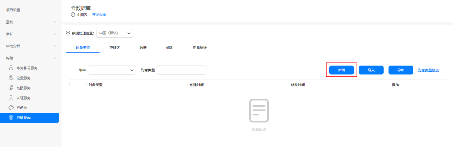 您需要基于AppGallery Connect控制台创建对象类型,请您遵循操作步骤创建示例中涉及的对象类型,并导出用于Web应用开发的json格式和js格式对象类型文件。不允许修改导出的json格式和js格式文件,否则会导致数据同步功能异常。