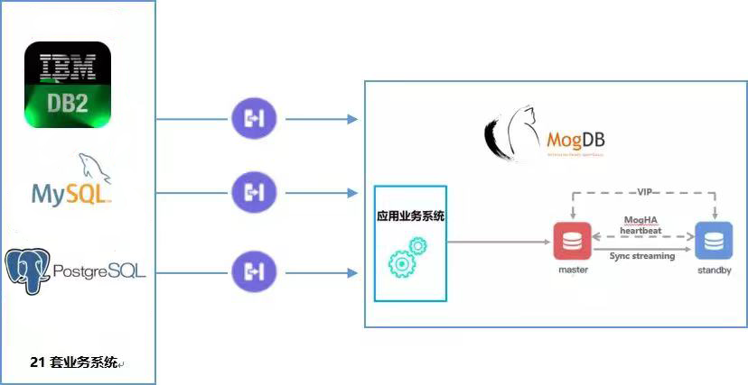 A城商行与云和恩墨达成合作意向后,双方便迅速做出了数据库替换规划,核心目标是将21套业务系统的 DB2、MySQL、PostgreSQL 等异构数据库平稳迁移至 MogDB。
