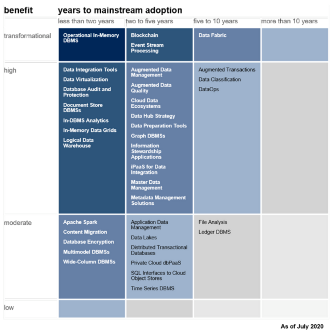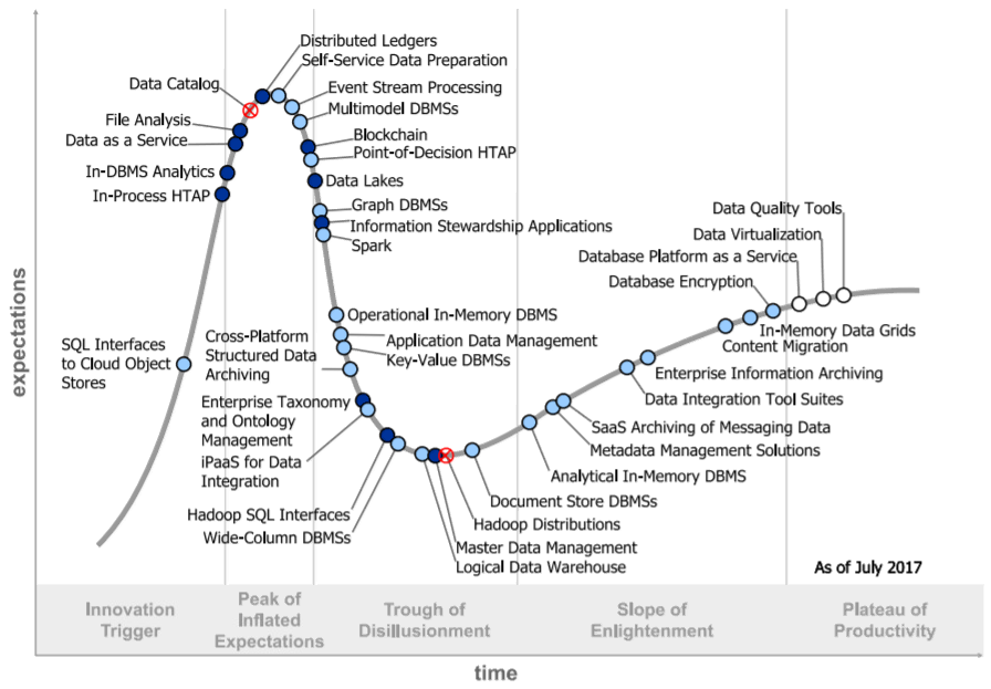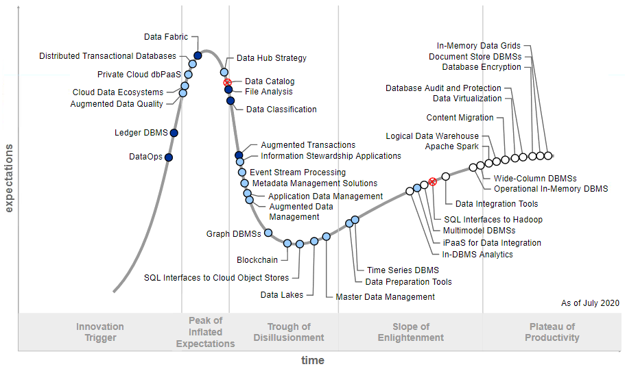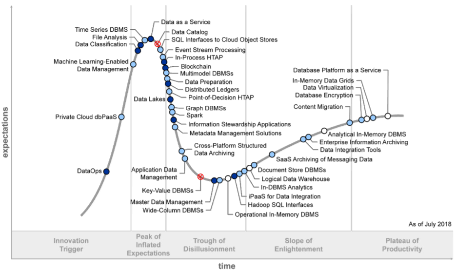 Gartner每年都会针对不同领域技术,出具相关的Hype Cycle报告。下面将以以数据(库)技术关联较高的《Hype Cycle for Data Management》进行说明。其整理当年受关注的技术及其发展阶段。