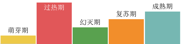 图中,横坐标表示技术的成熟度(Time),纵轴表示技术受关注的程度(Visibility)。其中的曲线表明:在相关领域里,每项技术的发展过程均可分为五个阶段:萌芽期、过热期、幻灭期、复苏期、成熟期。