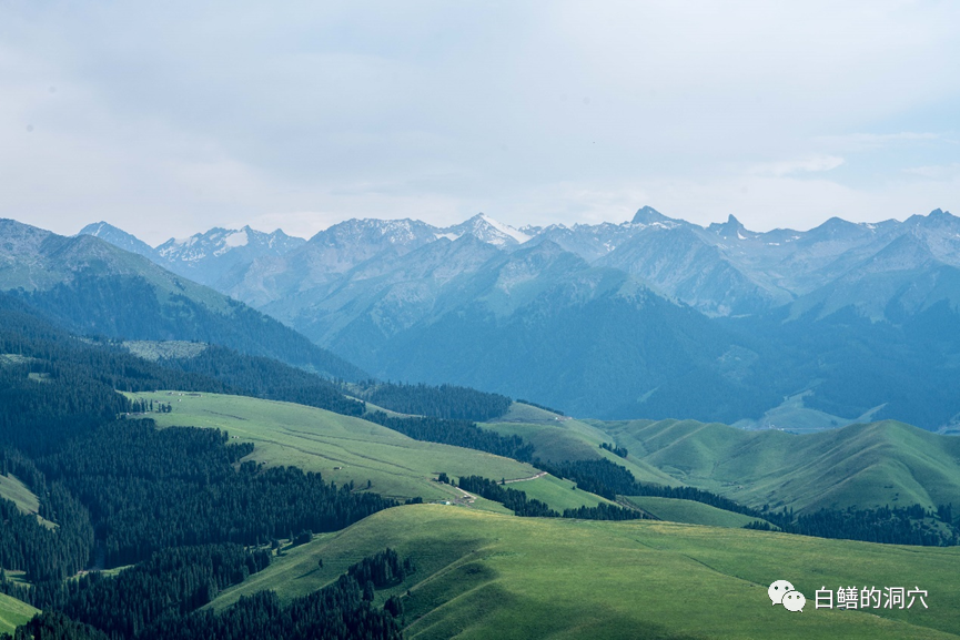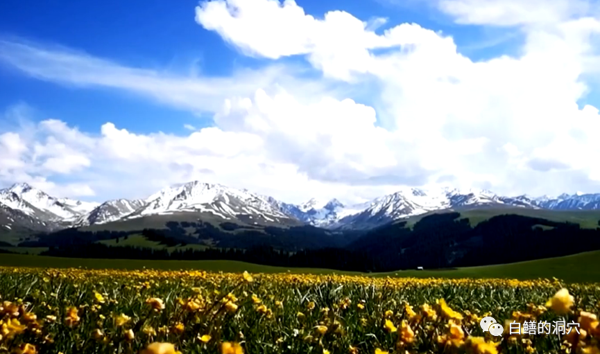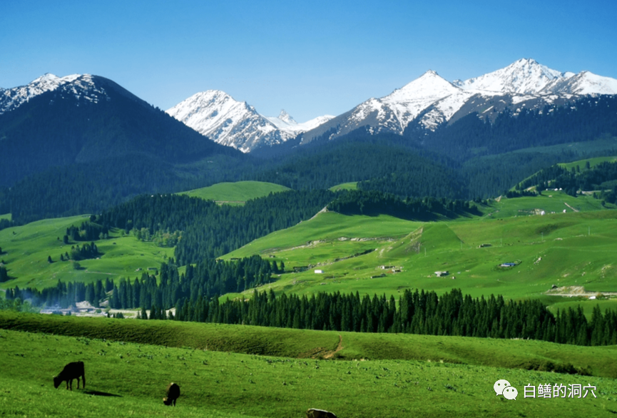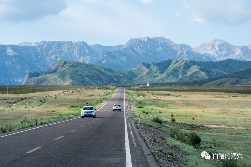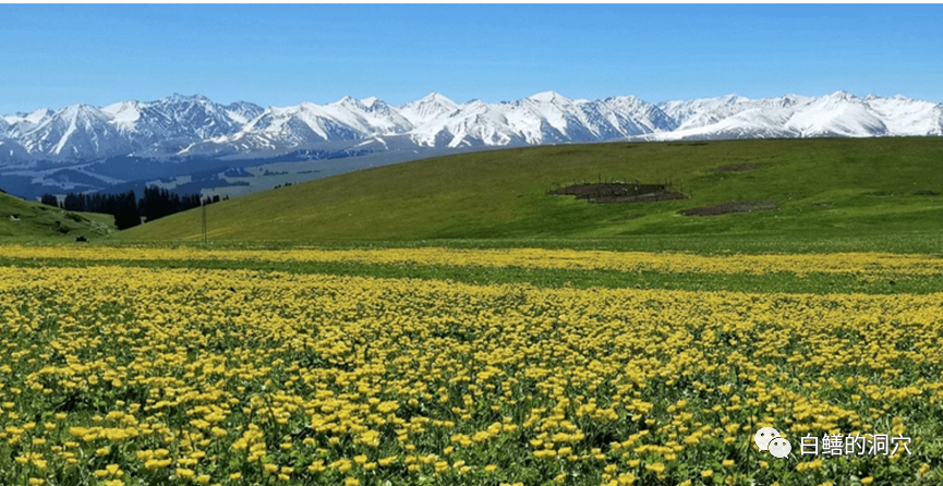 穿着短袖开着车,看着草原和雪山,这种体验并不容易看到,在加州东部INYO山区自驾时有过这种体验。在新疆,你依然可以看到这样的风景。