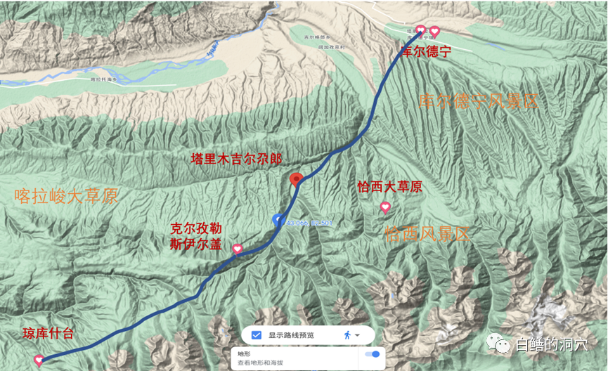 从地形图上看,琼库什台到库尔德宁的这条徒步线路是行走在天山的一个山沟里,途中经过西喀拉峻草原、东喀拉峻草原、恰西草原、苏科伦草原、库尔德宁杉树林等景区。可以看到喀拉峻草原深处的只有徒步者才能看到的风景。