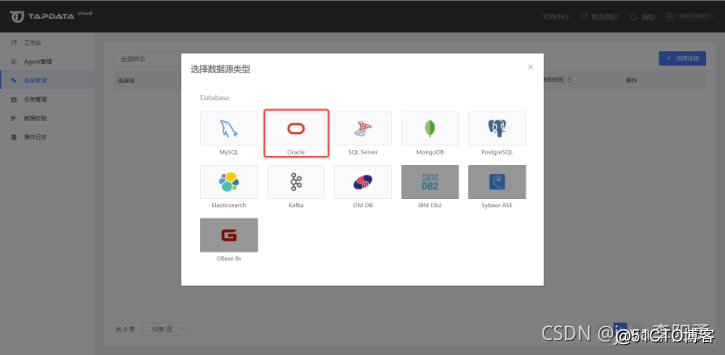 1. 点击 Tapdata Cloud 操作后台左侧菜单栏的【连接管理】,然后点击右侧区域【连接列表】右上角的【创建连接】按钮,打开连接类型选择页面,然后选择Oracle
