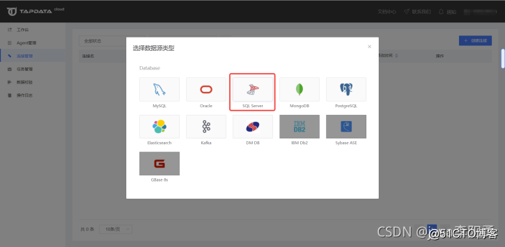 3. 同第一步操作,点击左侧菜单栏的【连接管理】,然后点击右侧区域【连接列表】右上角的【创建连接】按钮,打开连接类型选择页面,然后选择 SQL Server