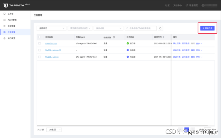 进入Tapdata Cloud 操作后台任务管理页面,点击添加任务按钮进入任务设置流程