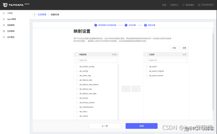 根据数据需求,选择需要同步的库、表,如果你对表名有修改需要,可以通过页面中的表名批量修改功能对目标端的表名进行批量设置。