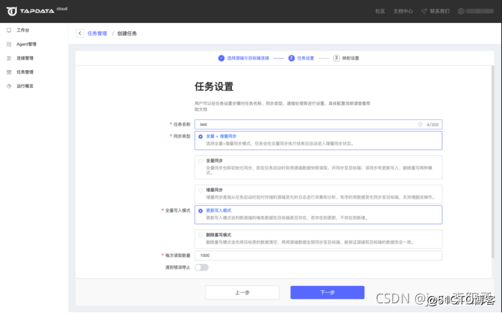 在以上选项设置完毕后,下一步选择同步类型,平台提供全量同步、增量同步、全量+增量同步,设定写入模式和读取数量。