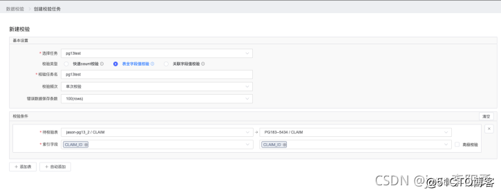 如果觉得不够用,也可以选择表全字段值校验 ,这个除了要选择待校验表外,还需要针对每一个表设置索引字段。