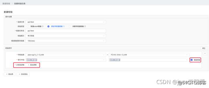 在进行表全字段值校验时,还支持进行高级校验。通过高级校验可以添加JS校验逻辑,可以对源和目标的数据进行校验。