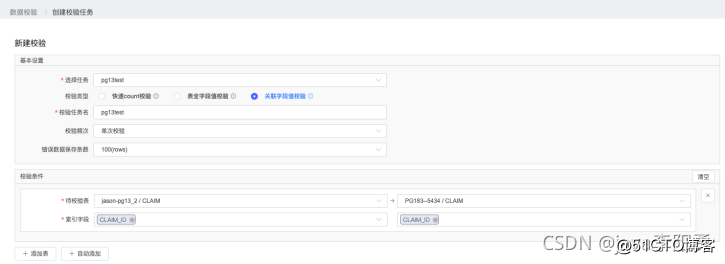 还有一个校验方式关联字段值校验 ,创建关联字段值校验时,除了要选择待校验表外,还需要针对每一个表设置索引字段。