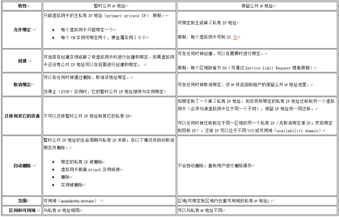 公共IP(Public IP)地址是一个在互联网上可访问的IPv4 Address;如果OCI租户的资源需要能与互联网进行直接的访问,则必须拥有一个公共的IP地址,同时针对于不同类型的资源,还需要满足其它的一些条件,如安全规则、网关等。