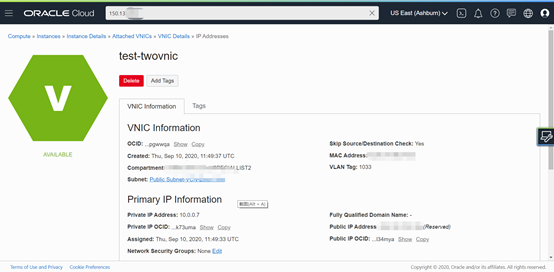 3. 点击该IP Address资源,界面将跳转到“Compute Instances Instance Details Attached VNICs VNIC Details / IP Addresses”