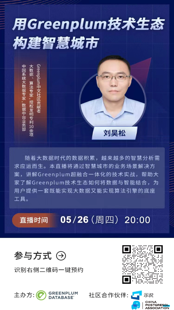 5月26日,Greenplum将举办今年第三场直播活动。本次直播将通过智慧城市的业务场景解决方案,讲解Greenplum超融合一体化的技术实战:大数据、Gis引擎、机器学习/深度学习引擎、检索引擎、知识图谱、PLPython相关技术的详细使用方法。