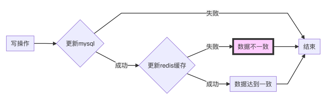 但是其中可能遇到一些问题,例如上述如果更新缓存失败(宕机等其他状况),将会使得数据库和Redis数据不一致。造成DB新数据,缓存旧数据。