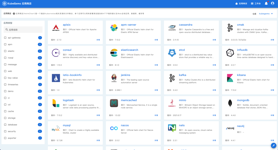 KubeGems应用商店(HelmChart)是一个描述Kubernetes相关资源的文件集合,单个应用可以用来部署某些复杂的HTTP服务器以及Web全栈应用、数据库、缓存等