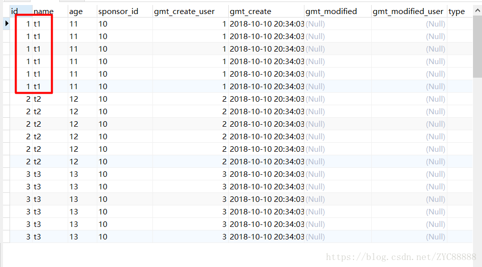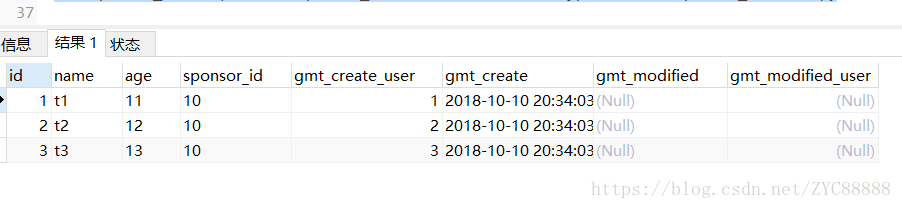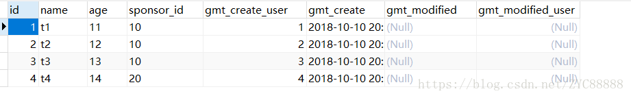 INSERT INTO `table1`(`id`, `name`, `age`, `sponsor_id`, `gmt_create_user`, `gmt_create`, `gmt_modified`, `gmt_modified_user`) VALUES (1, 't1', '11', '10', 1, '2018-10-10 20:34:03', NULL, NULL);