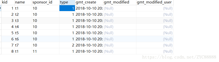 INSERT INTO `table2`(`kid`, `name`, `sponsor_id`, `type`, `gmt_create`, `gmt_modified`, `gmt_modified_user`) VALUES (1, 't1', '10', 1, '2018-10-10 20:38:10', NULL, NULL);