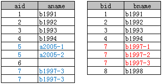 对于上述SQL同样可以将“A.aname = B.bname”改成“B.bname = A.aname”,执行后B表将会被修改,但是执行后B表会增加三行“0, a2005-1;0, a2005-2;0, a2006”,这也不难理解,因为Left Join执行后,B表会出现三行空值。