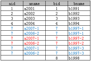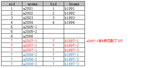 A表所有记录都会显示,A表中没有被匹配的行(如aid=5、6的行)相应内容则为NULL。 返回的记录数一定大于A表的记录数,如A表中aid=7行被B表匹配了3次(因为B表有三行bid=7)。