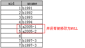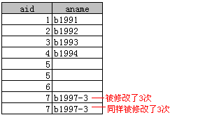 aid=5、6的记录,被更新为NULL aid=7的记录,被更新了3次,依次是“b1997-1”、“b1997-2”、“b1997-3”,因此其结果为最后一次更新“b1997-3”