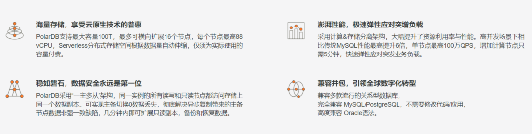 云原生关系型数据库PolarDB、云原生分布式数据库PolarDB-X、云原生数据仓库AnalyticDB(ADB)表面上看起来和传统数据库没有很大的区别,都具有存储引擎、优化引擎、界面引擎等,但是底层对资源的使用和调度却发生了翻天覆地的变化。虽然底层发生了变化,但希望对于用户来说,是一个透明的感受不到的改变。