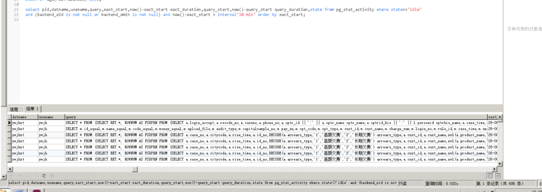 51789 192.168.7.36(41423) ywxt ywxt 2020-10-26 03:07:11 UTC 00000 69701 1 0 170881 LOG: execute <unnamed>: SELECT count(1)FROM (SELECT ………………) XTABLE