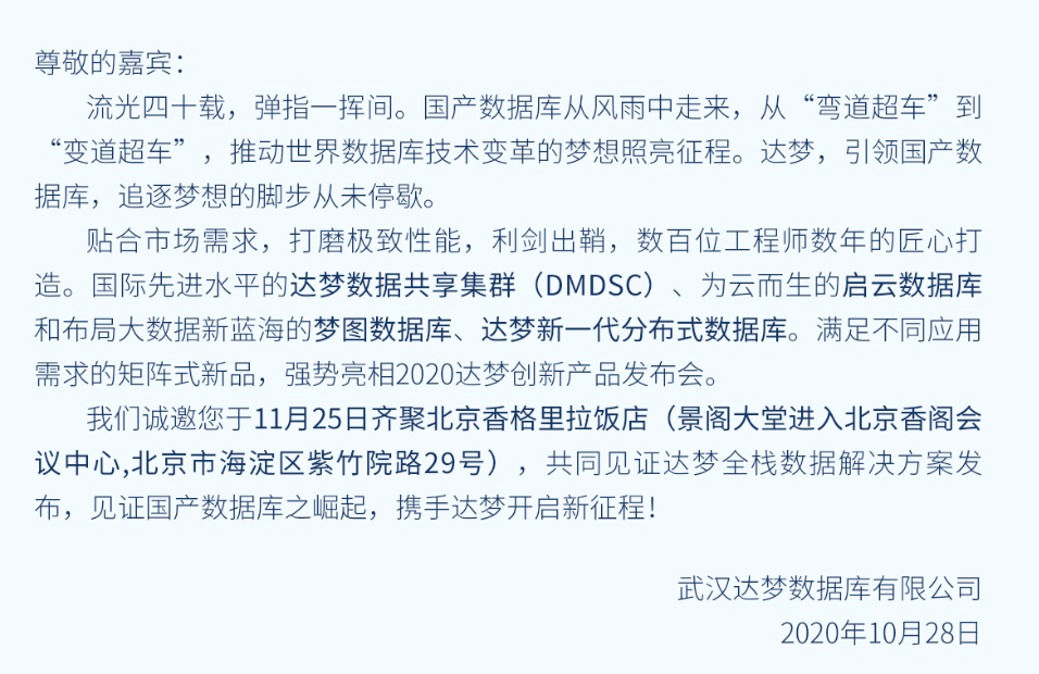 10月末,达梦的同学就给我发来一封邀请函,11月25日,达梦将在北京香格里拉饭店召开2020达梦创新产品发布会,问我感兴趣不。