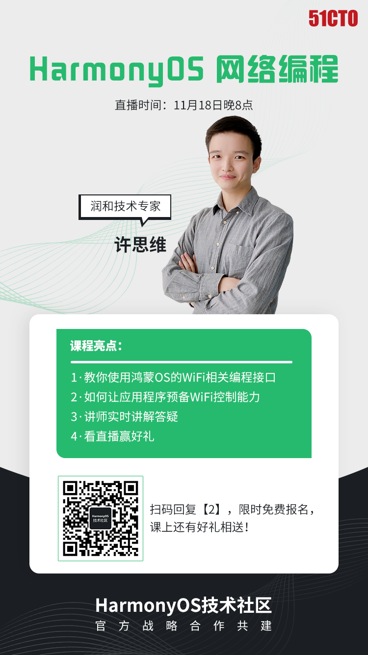 2020 年 11 月 18 日(周三)晚 20:00,我将为大家做一场《Harmony OS网络编程》的直播公开课,针对上述问题一一进行讲解与演示。