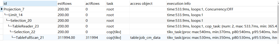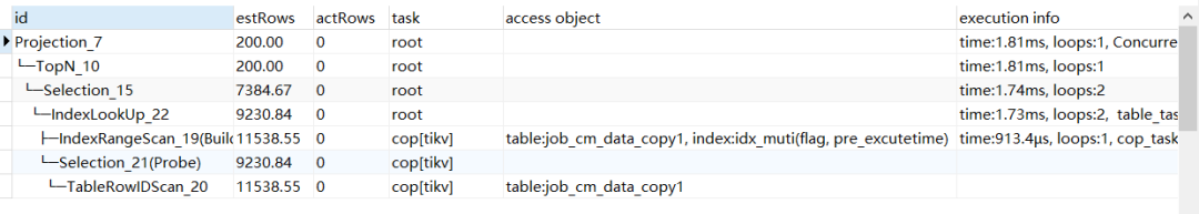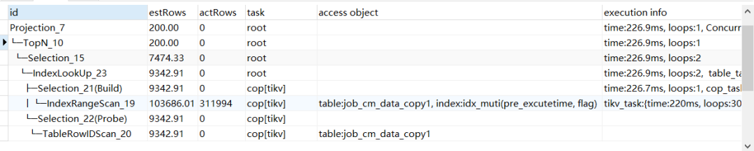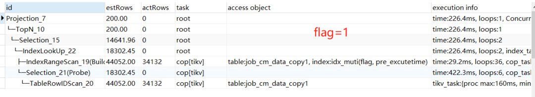 ```sqlid task estRows operator info actRows execution info memory diskProjection_7 root 200 test_ba.job_cm_data.id, test_ba.job_cm_data.common_job_type, test_ba.job_cm_data.org_code, test_ba.job_cm_data.key_one, test_ba.job_cm_data.key_two, test_ba.job_cm_data.key_three, test_ba.job_cm_data.key_four, test_ba.job_cm_data.key_five, test_ba.job_cm_data.key_six, test_ba.job_cm_data.key_seven, test_ba.job_cm_data.key_eight, test_ba.job_cm_data.permission_one, test_ba.job_cm_data.permission_two, test_ba.job_cm_data.permission_three, test_ba.job_cm_data.cur_thread, test_ba.job_cm_data.group_id, test_ba.job_cm_data.max_execute_count, test_ba.job_cm_data.remain_execute_count, test_ba.job_cm_data.total_execute_count, test_ba.job_cm_data.pre_excutetime, test_ba.job_cm_data.related_data, test_ba.job_cm_data.delay_time, test_ba.job_cm_data.error_message, test_ba.job_cm_data.flag, test_ba.job_cm_data.ynflag, test_ba.job_cm_data.create_time, test_ba.job_cm_data.update_time, test_ba.job_cm_data.create_user, test_ba.job_cm_data.update_user, test_ba.job_cm_data.ip, test_ba.job_cm_data.version_num 0 time:1.17s, loops:1, Concurrency:OFF 83.8 KB N/A└─Limit_14 root 200 offset:0, count:200 0 time:1.17s, loops:1 N/A N/A└─Selection_31 root 200 eq(test_ba.job_cm_data.ynflag, 1) 0 time:1.17s, loops:1 16.3 KB N/A└─IndexLookUp_41 root 200 0 time:1.17s, loops:1, index_task: {total_time: 864.6ms, fetch_handle: 26.1ms, build: 53.3ms, wait: 785.2ms}, table_task: {total_time: 4.88s, num: 17, concurrency: 5} 4.06 MB N/A├─IndexRangeScan_38 cop[tikv] 7577.15 table:job_cm_data, index:idx_group_id(group_id), range:["GROUP_MATERIAL","GROUP_MATERIAL"], keep order:true 258733 time:3.34ms, loops:255, cop_task: {num: 1, max: 2.45ms, proc_keys: 0, rpc_num: 1, rpc_time: 2.43ms, copr_cache_hit_ratio: 1.00}, tikv_task:{time:146ms, loops:257} N/A N/A└─Selection_40 cop[tikv] 200 eq(test_ba.job_cm_data.cur_thread, 1), eq(test_ba.job_cm_data.flag, 0), lt(test_ba.job_cm_data.pre_excutetime, 2022-04-27 11:55:00.018000) 0 time:4.68s, loops:17, cop_task: {num: 18, max: 411.4ms, min: 15.1ms, avg: 263ms, p95: 411.4ms, max_proc_keys: 20480, p95_proc_keys: 20480, tot_proc: 4.41s, tot_wait: 6ms, rpc_num: 18, rpc_time: 4.73s, copr_cache_hit_ratio: 0.00}, tikv_task:{proc max:382ms, min:12ms, p80:376ms, p95:382ms, iters:341, tasks:18}, scan_detail: {total_process_keys: 258733, total_process_keys_size: 100627600, total_keys: 517466, rocksdb: {delete_skipped_count: 0, key_skipped_count: 258733, block: {cache_hit_count: 1296941, read_count: 0, read_byte: 0 Bytes}}} N/A N/A└─TableRowIDScan_39 cop[tikv] 7577.15 table:job_cm_data, keep order:false 258733 tikv_task:{proc max:381ms, min:12ms, p80:375ms, p95:381ms, iters:341, tasks:18} N/A N/A```