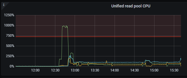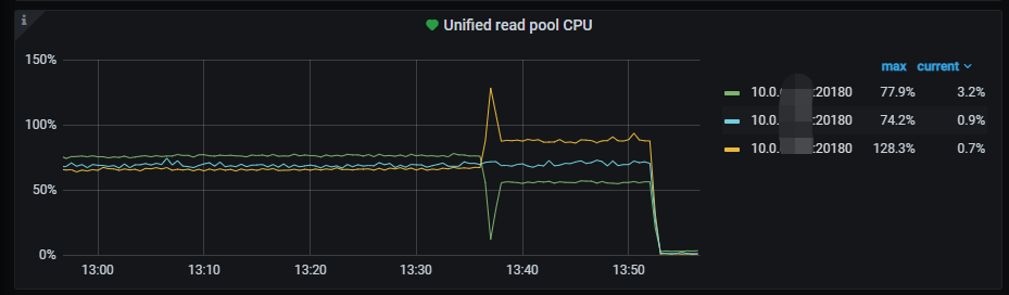 经过手动切分region后把请求分摊到3个TiKV节点中,但Unified Readpool CPU还是都达到了80%左右,热力图最高每分钟流量6G。