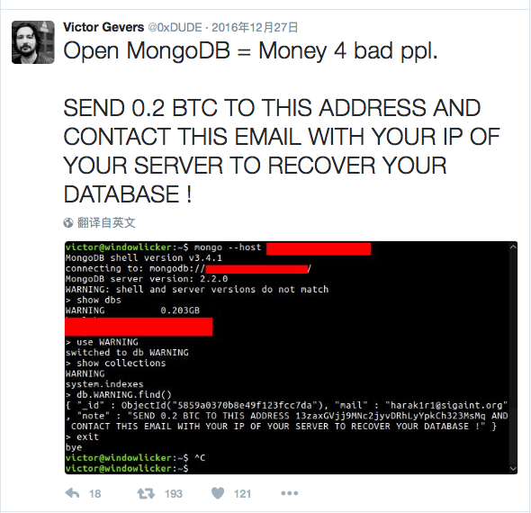 用户rpm包安装的mongo数据库,是没有用户权限认证的,这样非常的不安全,攻击者使用特定的脚本就能连上你的mongo数据库,并将数据进行加密,并给你留勒索信息