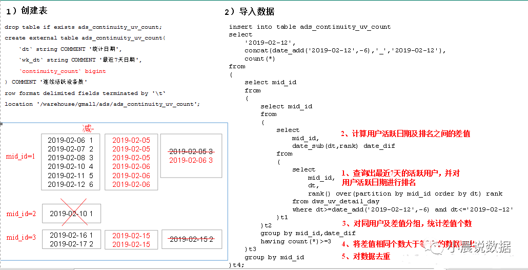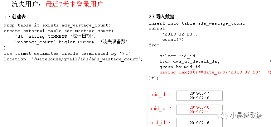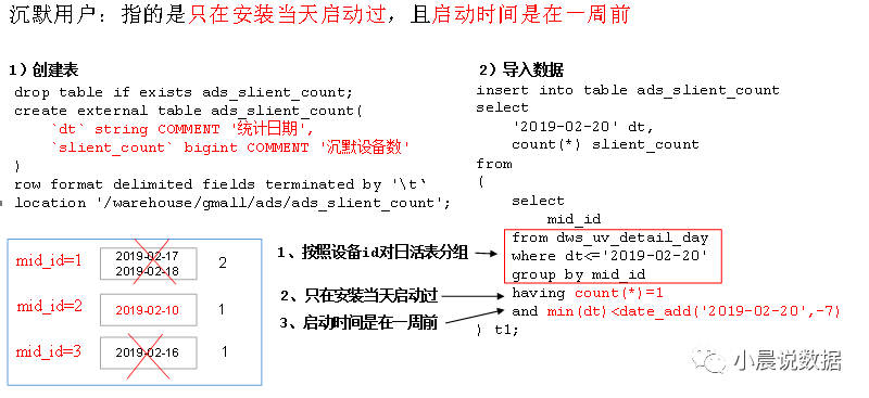 partition(dt='2019-02-10') from dwd_start_log where dt='2019-02-10' group by mid_id ( mid_id设备唯一标示 )