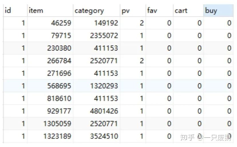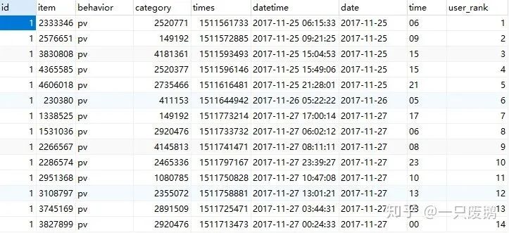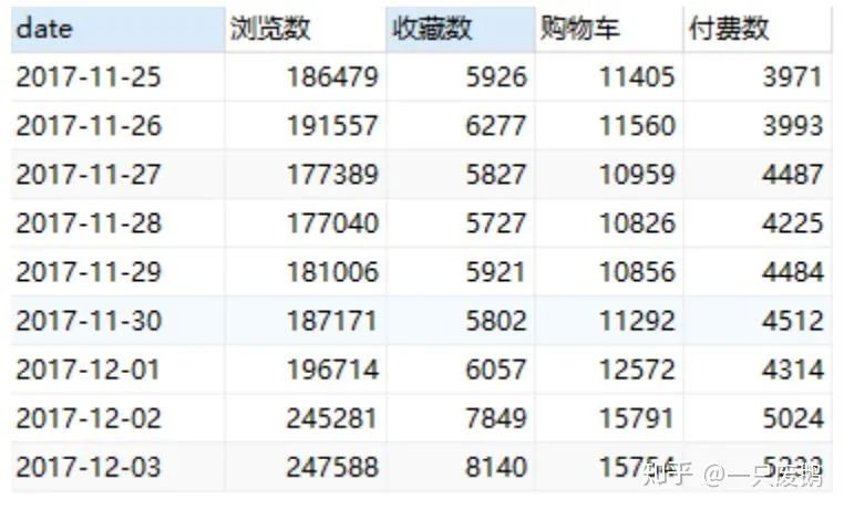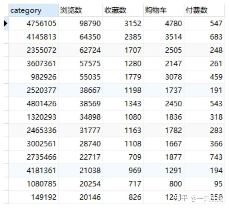 SUM(CASE WHEN behavior='pv' THEN 1 ELSE 0 END)AS '浏览数',