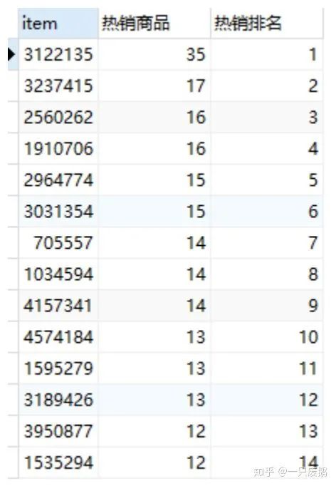 (select * from (select item,count(1) as 热销商品,row_number()over(order by count(1) desc )as 热销排名 from user where behavior='buy' group by item)as A where A.热销排名<51) as A